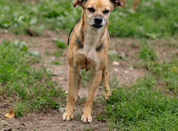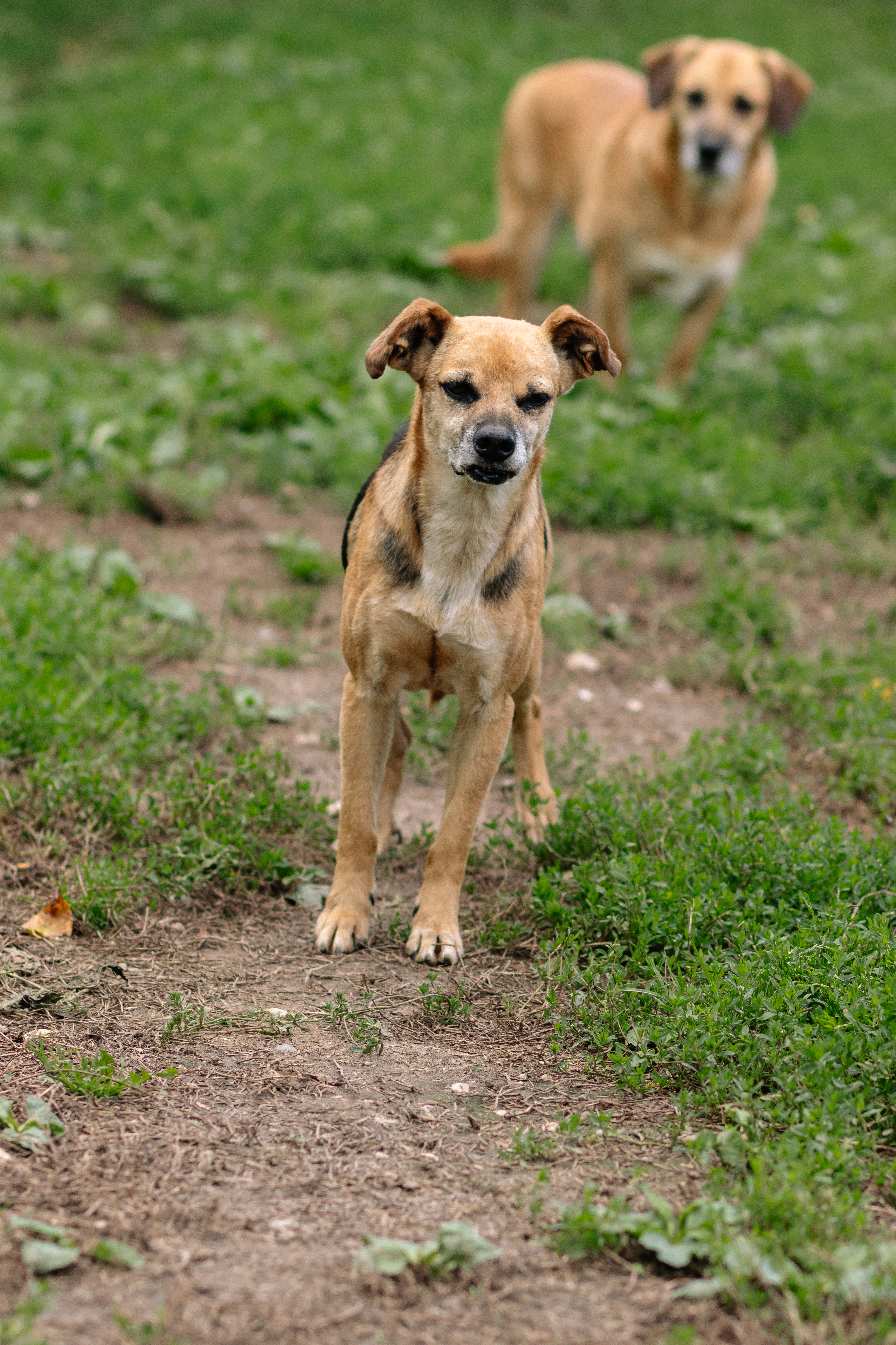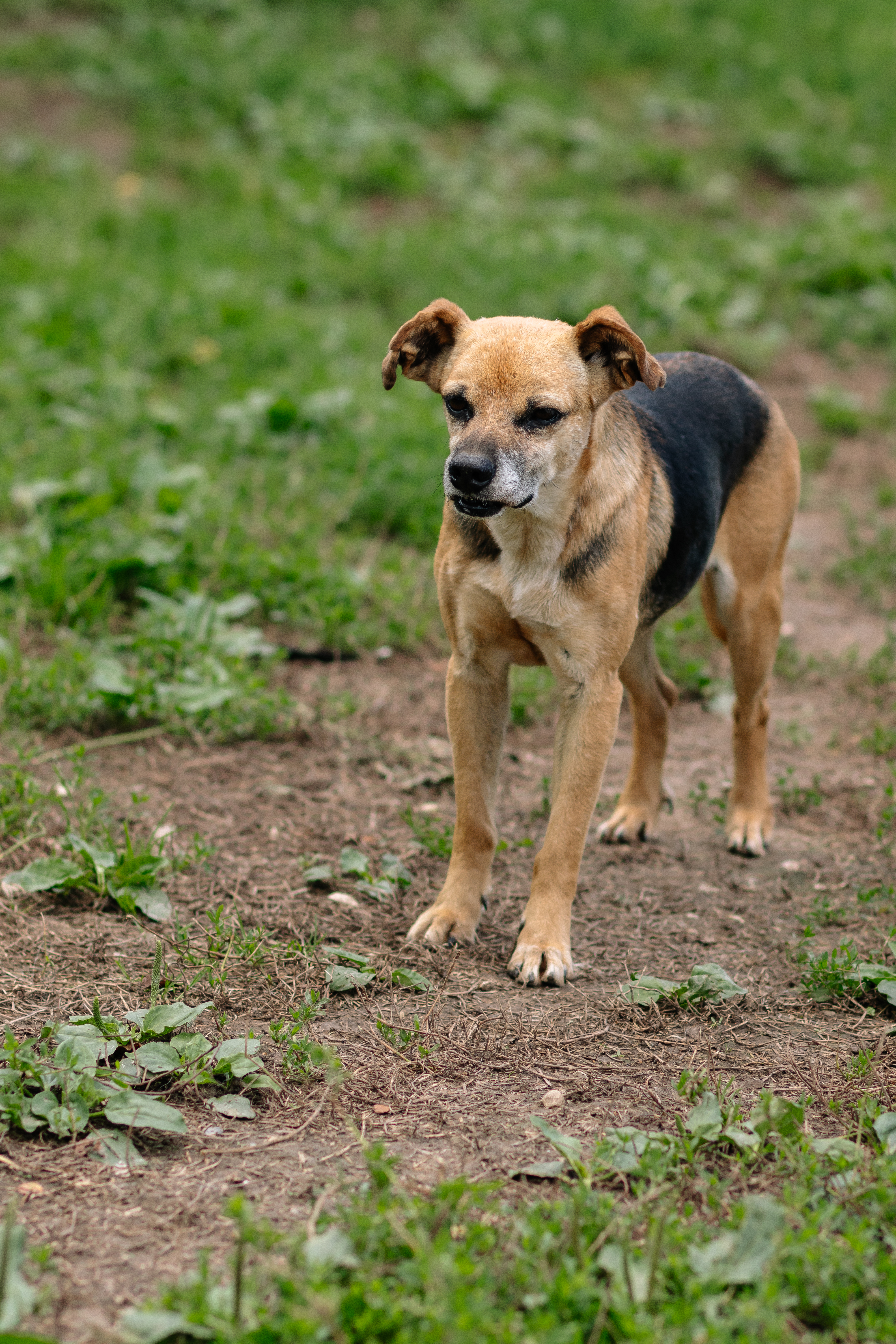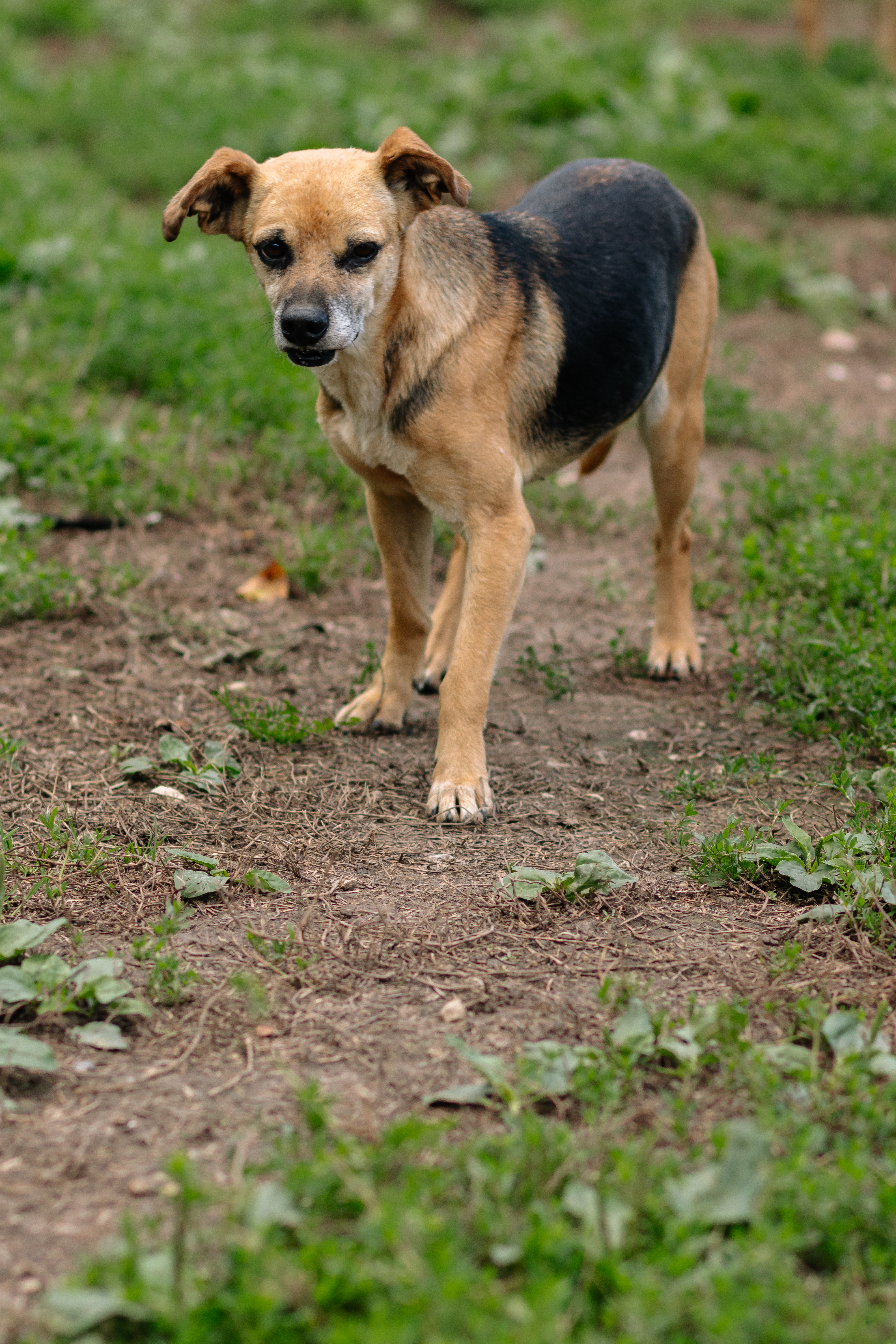 Свеколка небольшая, аккуратная, ниже колена. У неё тонкие лапки, выразительная мордочка и внимательный взгляд, который постоянно оценивает, можно ли подойти ближе. Она не агрессивная — просто осторожная. Делает шаг вперёд, потом назад, будто все время проверяет, безопасно ли.