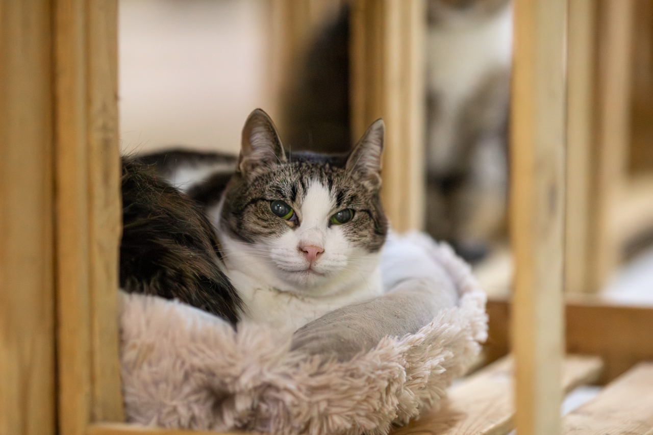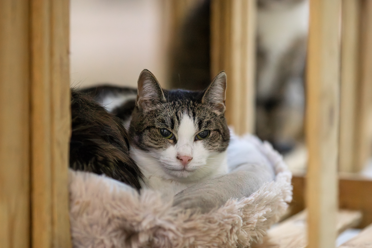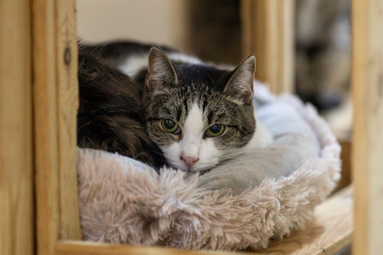 Она у нас много лет и за эти годы она так и не научилась полностью доверять человеку. Она пугливая, держит дистанцию, предпочитает наблюдать из укрытия. Резкие движения и навязчивость её пугают. Тюрка не конфликтная — просто очень осторожная. При этом она невероятно красивая: выразительный табби-окрас с аккуратными белыми участками, мягкая шерсть и трогательный розовый нос, который особенно выделяется на её мордочке. Когда Тюрка расслабляется, в её взгляде появляется спокойствие — и становится видно, какая она на самом деле нежная.